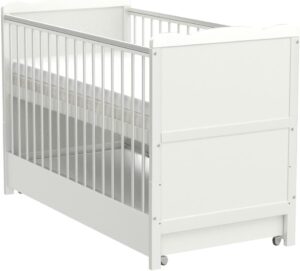 La cuna evolutiva ajustable cuenta con 3 posiciones de altura, adaptándose al crecimiento del bebé y pudiendo convertirse fácilmente en cama infantil. Incluye un amplio cajón inferior oculto con tapa, ideal para almacenamiento.
